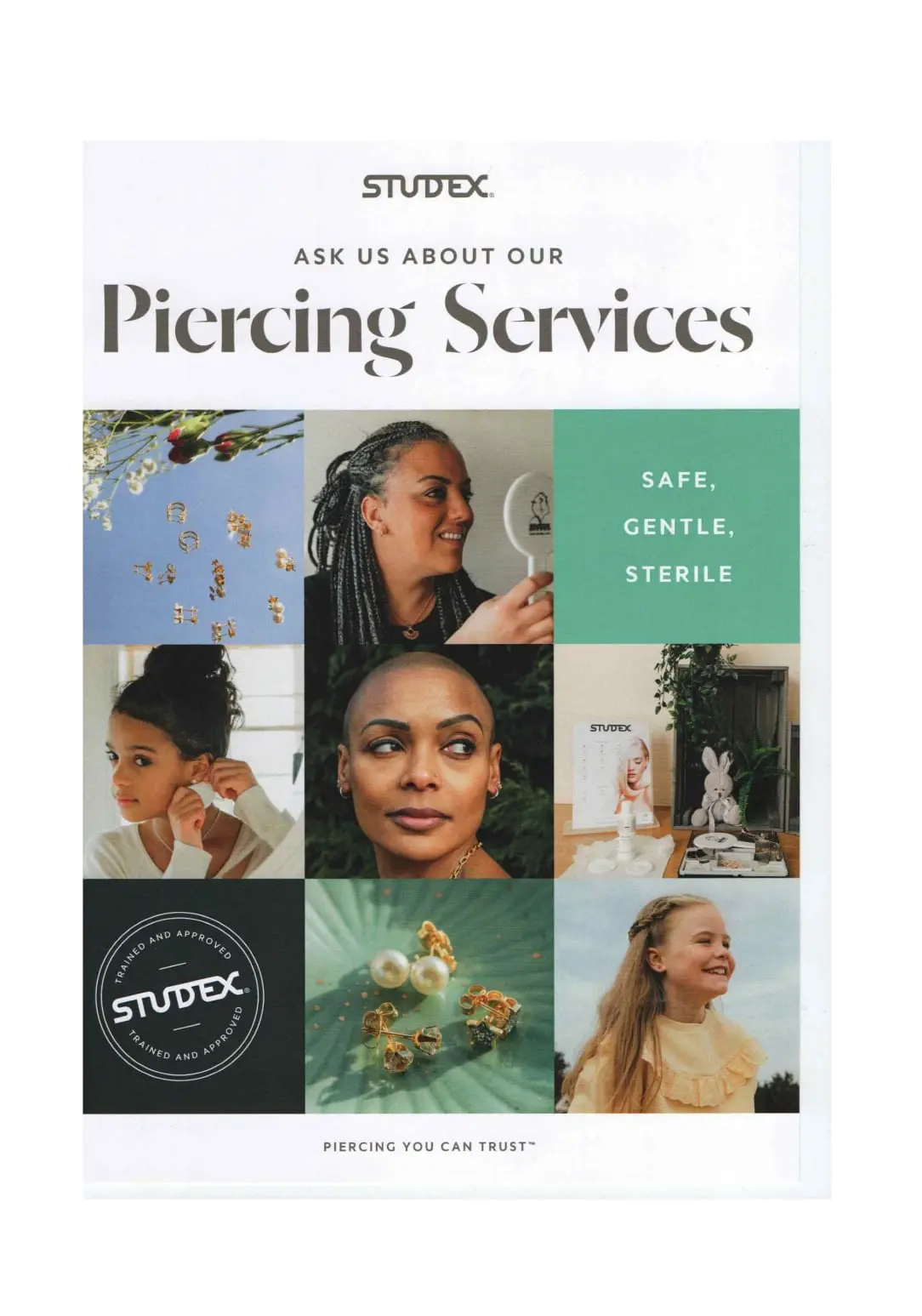 Price includes 9ct gold jewellery and aftercare solution. Both lobes can be done simultaneously if booked in advance. Under 16’s must be accompanied by an adult.